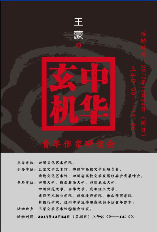 为了学习和贯彻十九大精神,增强我省青年作家和文学爱好者的文化自信,推动王蒙研究。由四川文化艺术学院主办,王蒙文学艺术馆、南边文化艺术馆、四川省高校文学发展组委会发展峰会和绵阳市高校文学社联合会共同承办的“王蒙《中华玄机》青年作家研读会”,将于2017年12月24日(周日)上午9:00——12:00在王蒙文学艺术馆五楼会议室举行。